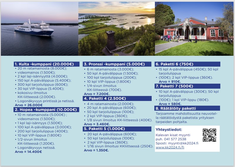 Järjestäjät ovat luoneet erilaisia paketteja yrityksille, jotka haluavat hyödyntää näkyvyyttä ja esitellä tuotteitaan tai palveluitaan. Paketit sopivat yrityksille, jotka haluavat profiloitua urheilussa, sekä niille, jotka haluavat hyötyä suuresta mainosarvosta. Vaihtoehtoja on kulta-, hopea- ja pronssipaketeista aina VIP-tuotteisiin ja erilaisiin lippupaketteihin. Tarjoamme myös näkyvyyttä stadionin mainospaikoilla, sanomalehtiliitteissä, sekä digitalisten kanavien kautta. Sisältöä on myös mahdollista räätälöidä kumppanin tarpeiden mukaan ja/tai tilata lippupaketteja ennakkoon.