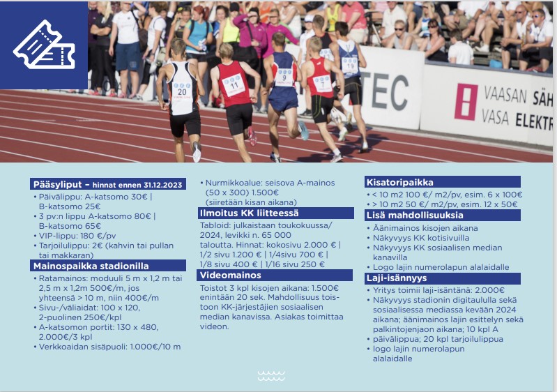 (3) Laji-isännyys, hinta 2.000€, yrityksen logo lajin numerolapun alalaidalla, logonäkyvyys stadionin digitaululla ja kuuluttajan äänimainos lajin esittelyn sekä palkintojenjaon aikana; 10 kpl pääkatsomon päivälippua; etuseteleitä 40€ edestä - taattu lajinäkyvyys sekä TV:ssä että paikan päällä!